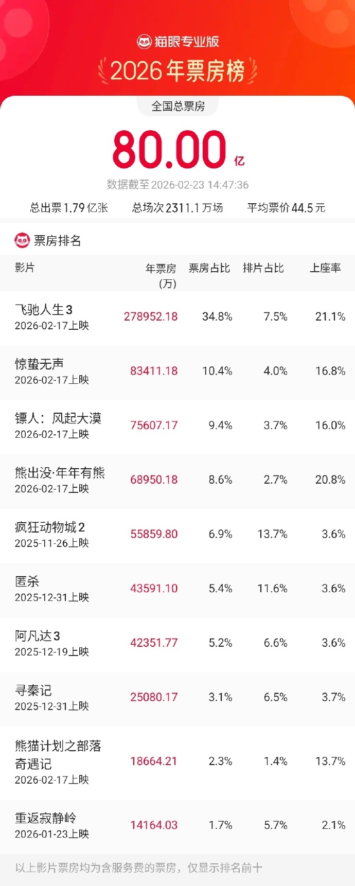 据猫眼专业版数据,截至2月23日14时48分,2026年年度总票房(含预售)突破80亿!《飞驰人生3》《惊蛰无声》《镖人:风起大漠》暂列年度票房榜前三位。